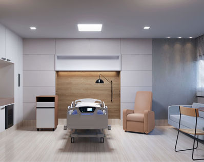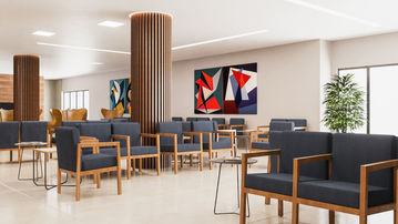 O projeto de interiores utiliza dos tons terrosos e mais sóbrios para aquecer os ambientes e fazer com que os usuários se sintam bem acolhidos e atendidos. Todo o mobiliário é escolhido de forma a atender as necessidades do usuário hospitalar, com assentos mais altos, espuma confortável e estrutura mais resistente e que deixem o usuário o mais confortável possível.